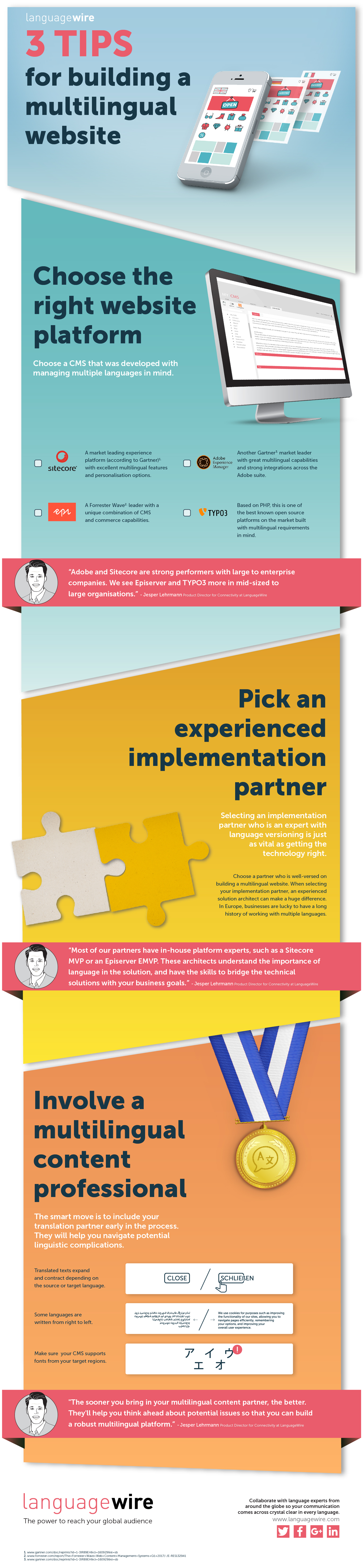 « Vous devez choisir un CMS qui a été développé avec la prise en charge de plusieurs langues à l’esprit, » déclare Jesper. « Recherchez des fonctionnalités comme le remplacement de langue, les workflows d’approbation et les options de mise en page personnalisables pour répondre aux demandes spécifiques du marché. Des plateformes comme Sitecore et Episerver excellent dans cette catégorie et sont toutes deux des choix sûrs pour l’organisation de marketing mondiale expérimentée. Chez LanguageWire, nous avons développé des solutions d’intégration pour un grand nombre de plateformes Web leaders sur le marché et ayant des capacités multilingues dans leur ADN. »