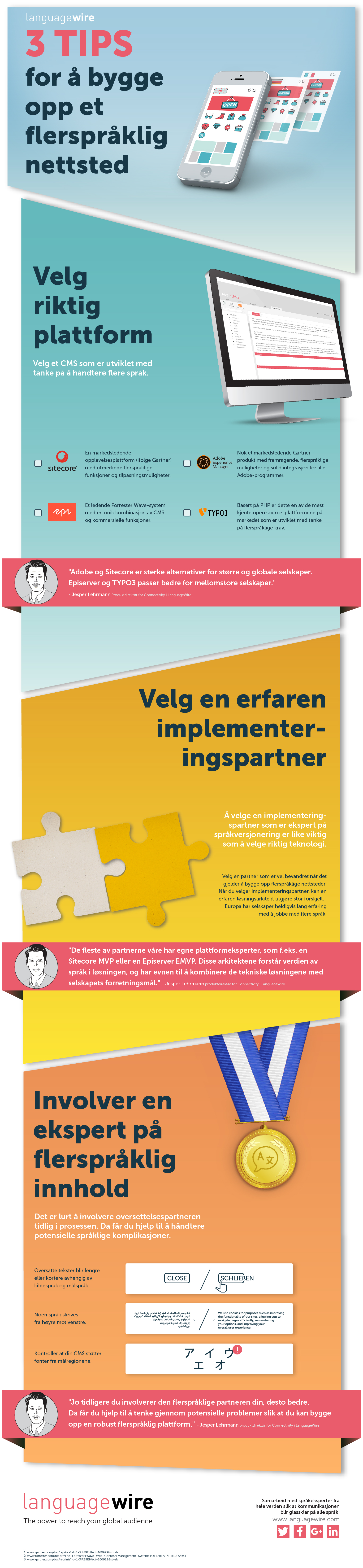 "Du må velge et CMS som er utviklet med tanke på å håndtere flere språk," sier Jesper. "Se etter funksjoner som language fallback, arbeidsflyt med validering og layoutalternativer som kan tilpasses spesifikke krav i markedet. Plattformer som Sitecore og Episerver er overlegne i denne kategorien og er begge trygge valg for erfarne, globale markedsføringsorganisasjoner. Vi i LanguageWire har bygget integrasjonsløsninger for en rekke markedsledende webbplattformer som har integrerte, flerspråklige muligheter"