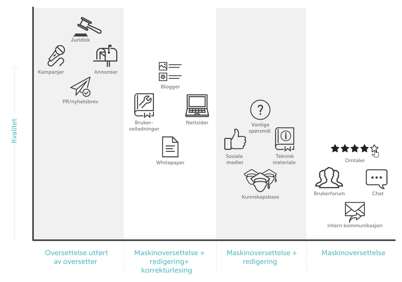 Dette innebærer at arbeidsflyt med maskinoversettelse, redigering og korrekturlesing er ideelt i de tilfellene oversettelsen ikke trenger å tilsvare en ny, gjennomarbeidet tekst. For eksempel til blogger, white papers eller bruksanvisninger. Til disse typene innhold, er det viktigste at innholdet er fullt forståelig for leseren. Innhold som skal vekke følelser, for eksempel markedsføringskampanjer, eller som behøver en nøyaktig og ordrett oversettelse, som juridiske dokumenter, krever manuell oversettelse.