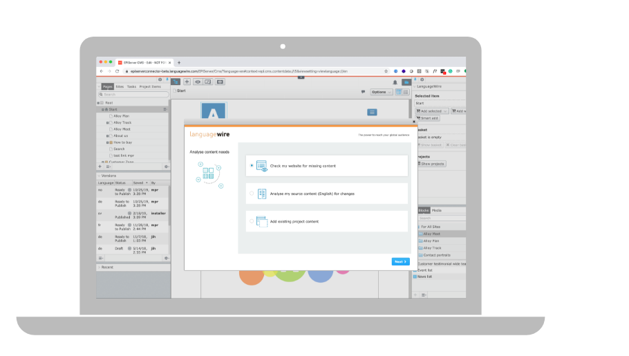 Restez au courant des différents projets de traduction à partir de votre CMS Optimizely ou connectez-vous simplement à LanguageWire. Il n’est pas nécessaire de garder la trace de centaines d’e-mails. Vous bénéficiez ainsi d’une sécurité accrue grâce au transfert de données avec chiffrement HTTPS.