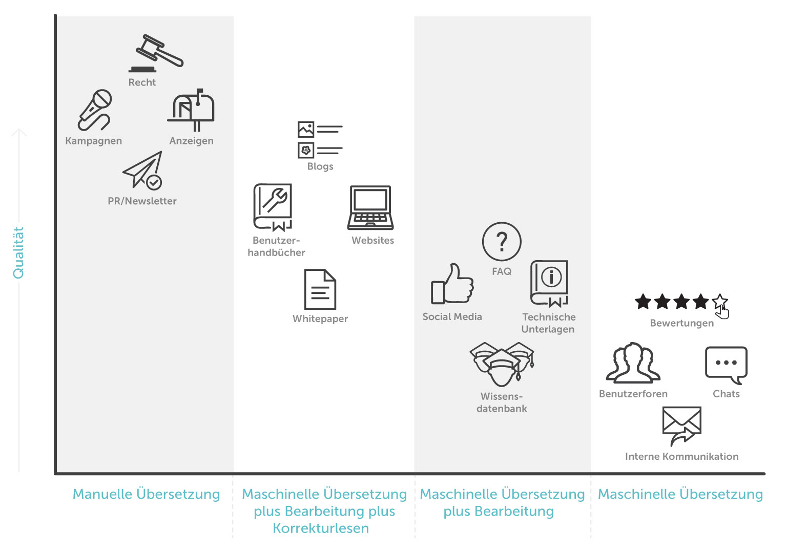Ein Workflow aus maschineller Übersetzung, Bearbeitung und Korrekturlesen ist ideal, wenn nicht jedes einzelne Wort sorgfältig ausgewählt werden muss. Das gilt zum Beispiel für Blogs, White Paper oder Benutzerhandbücher. Bei diesen Arten von Content ist es am wichtigsten, dass der Leser den Inhalt versteht. Inhalte, die Emotionen beim Leser hervorrufen sollen, wie z. B. eine Marketingkampagne, oder bei denen eine genaue Übersetzung mit Fachbegriffen erforderlich ist, wie bei Rechtsdokumenten, sind bei einem echten Übersetzer am besten aufgehoben.