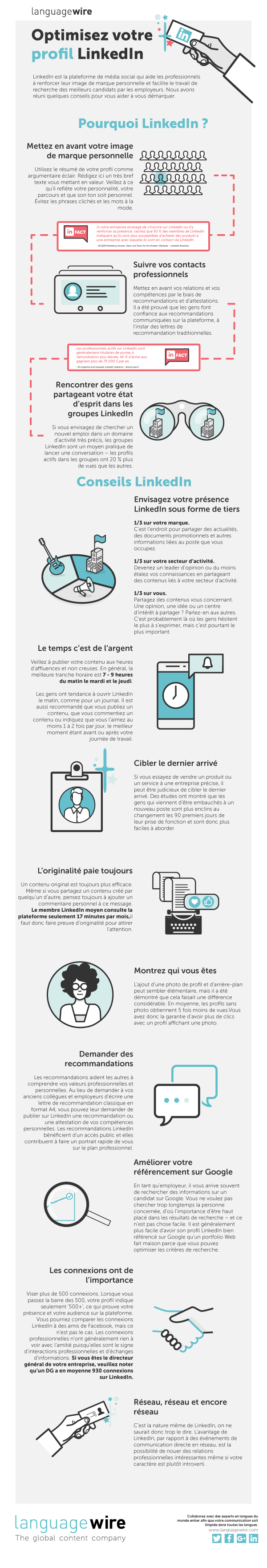 Vous savez maintenant comment tirer le meilleur profit de LinkedIn. Comme aide-mémoire de nos conseils, n’hésitez pas à utiliser ce résumé graphique pratique qui met en exergue les éléments clé du billet du blog.