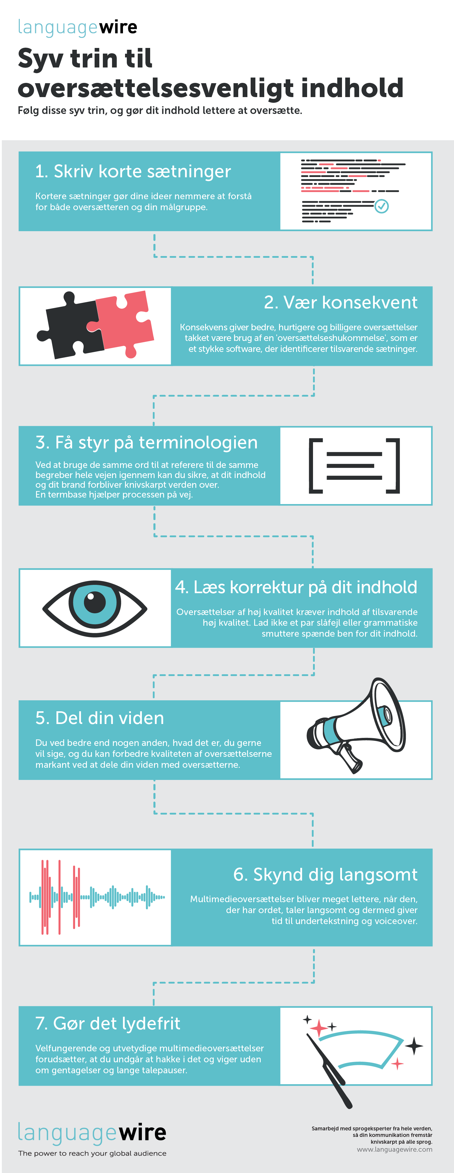 Keep it simple! Længere sætninger er vanskeligere at oversætte og kommer hurtigt til at virke klodsede og unaturlige i en oversættelse. Kortere sætninger lader budskabet træde tydeligere frem. Det gør også dine tekster lettere at oversætte og samtidig får læseren indtryk af, at de let kan følge med i teksten.